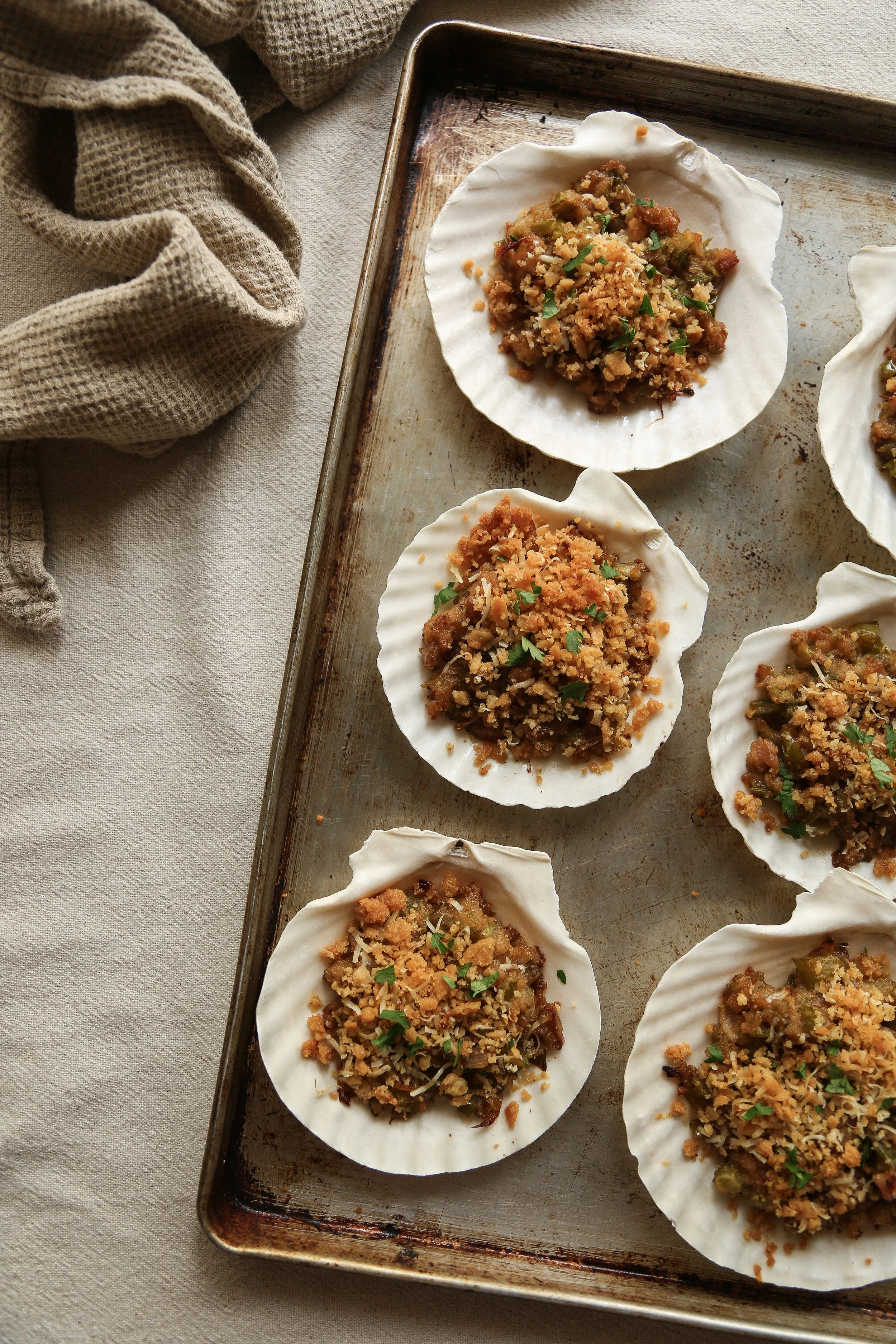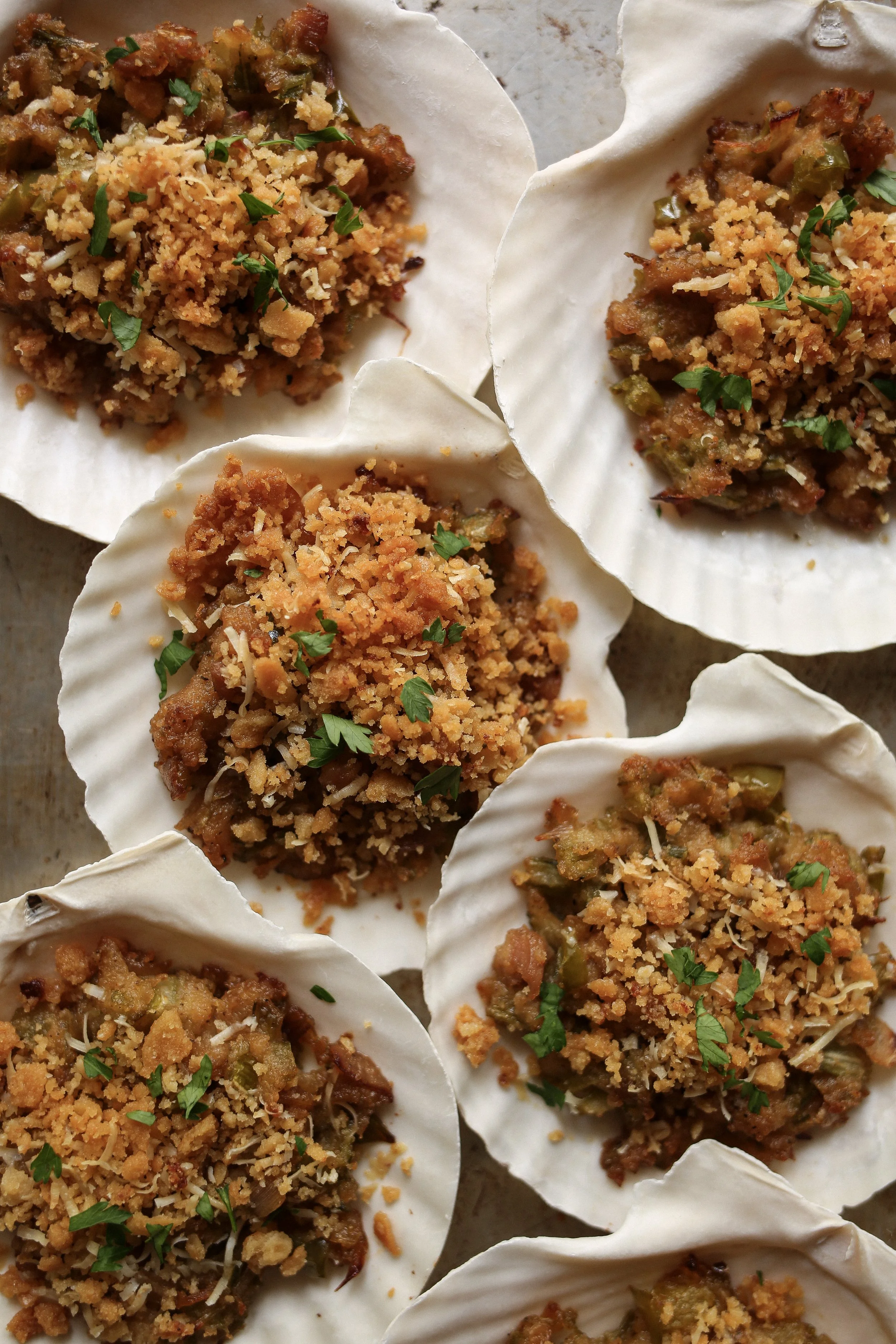 Assemble the clams and crumb topping all the way up to the baking step. At this point you can either add the crumb topping on, or, as I like to do, store it separately and then sprinkle it on the clams right before baking them. Store the topping in an airtight container or a dish covered with plastic wrap, and place the clams on a baking sheet and cover with plastic wrap. Then store before in the refrigerator for up to 6 hours before baking.