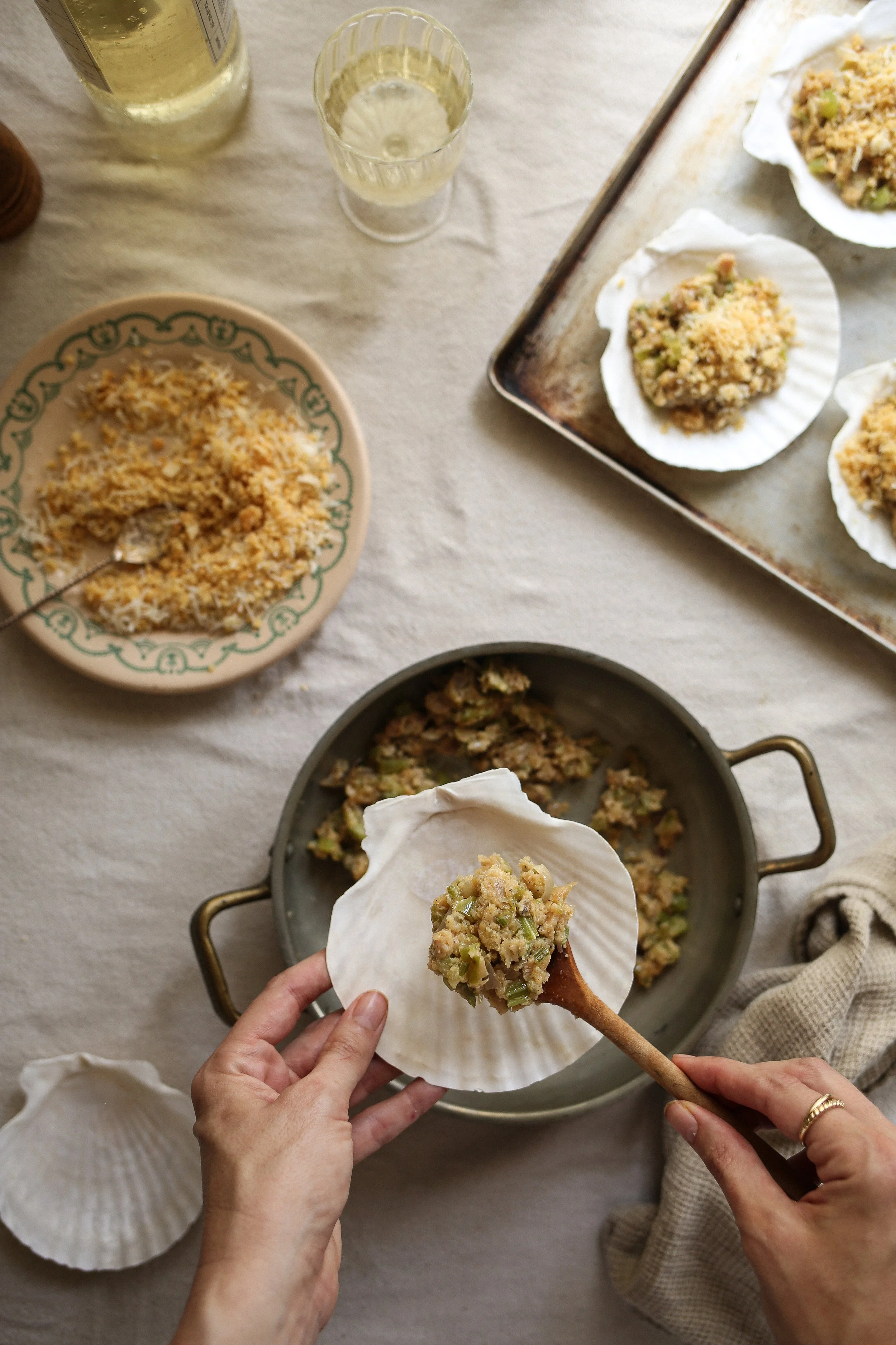 Divide the clam mixture evenly among 3-4 baking shells or individual baking dishes. Top each clam with a spoonful of the cracker mixture and then place them on a baking sheet.BAKE