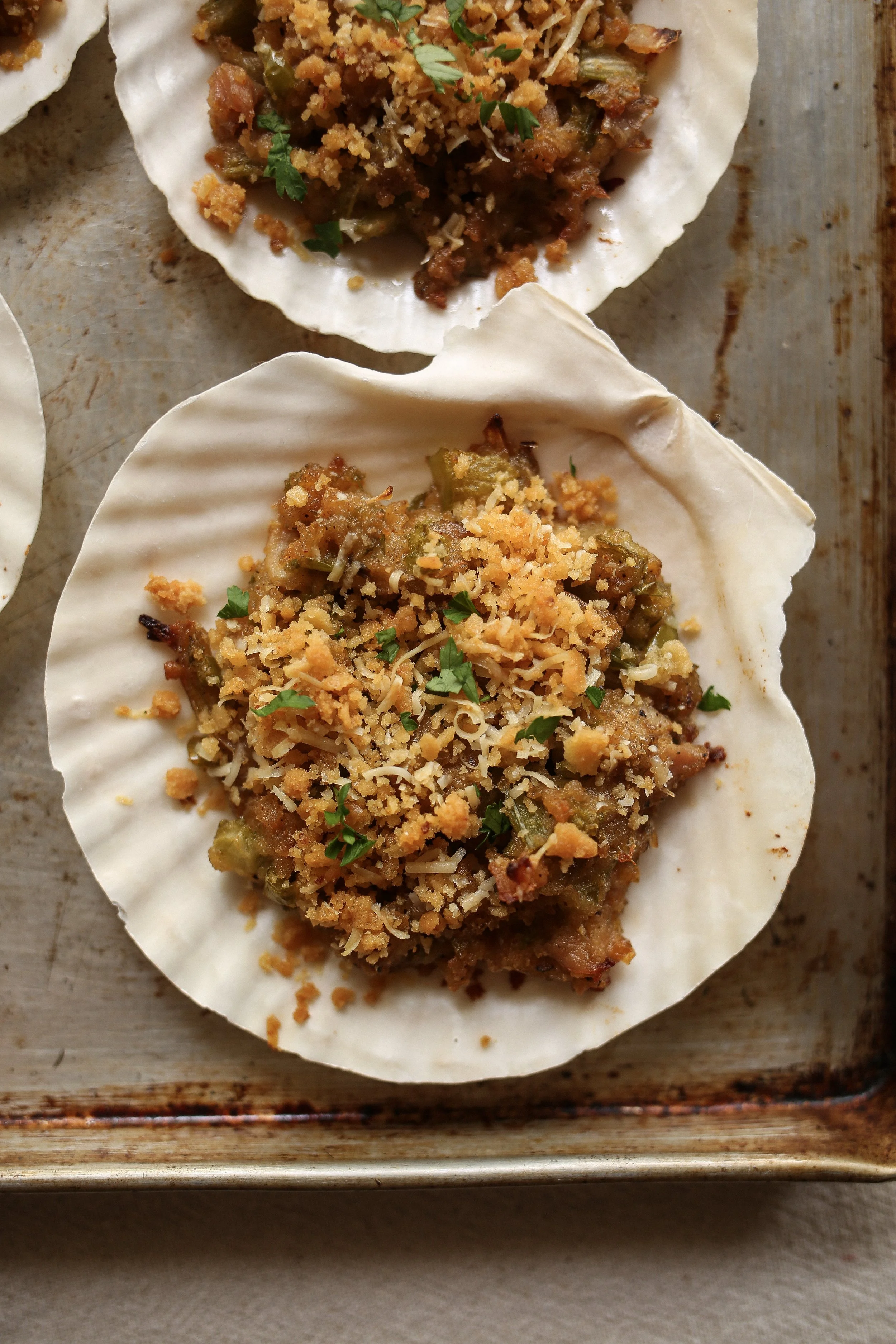 Alternatively, you can assemble and bake the clams ahead of time. Just allow them to cool fully, then cover them with plastic wrap (I keep them right on the baking sheet). Then store them in refrigerator for up to 24 hours. Once you’re ready to serve them, simply remove the plastic wrap and reheat them at 350°F for 5–8 minutes, or until warmed through and bubbling slightly. Then garnish with parsley and serve.