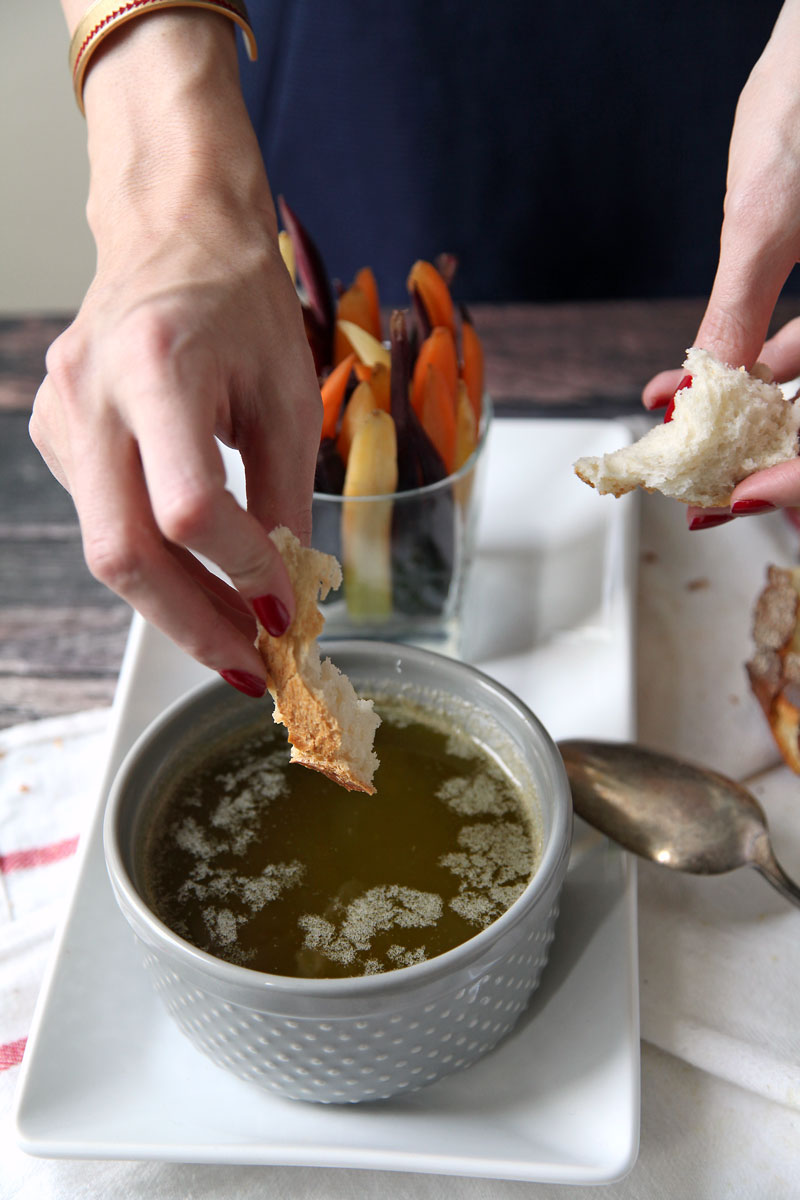 Comin' atcha today- a lifetime's supply worth of butter and olive oil disguised as one delectable Italian treat. Don't even think about fighting it. Just don't. After all, it's unofficially the season of butter, sugar and extra calories, and who's going to say no to those things?! OBVIOUSLY not someone who writes a food blog (and probably not someone who is reading it, either). As I mentioned in this post, Mr. RC and I do our best to sniff out the local cuisines wherever we travel. Bagna càuda (meaning 'hot bath'), a dish traditionally enjoyed in the fall and winter, was one of the things that made the list to try in Torino, but we somehow never actually got around to eating it (despite the fact that it was on every single menu). When I mentioned it to my Mom and Grandma, asking if they had ever heard of it (since it's from the same region as our family), they both exclaimed "Oh yes! Oh Bagna càuda! Of course, of course! It's delicious!". So even though I didn't try it in Italy, I've apparently eaten several times in my younger years. I mean, phew! What a relief! Heaven forbid if I'd have to go back to Italy just to eat something! Obviously, I have no recollection of ever having tried this dish (reported to be one of the Pope's favorite treats!), and since I missed the opportunity to eat it in Italy, I figured, why not recreate it at home as a holiday treat? So Mr. RC and I did just that. After all, I had some first-press olive oil on hand (featured in my Italy Gift Guide), just waiting to be used in a special recipe. In fact, this dish uses so much olive oil you could consider it the olive oil version of fondue. There's also some garlic in there somewhere, some butter (Because when you're already using so much olive oil, why not?!) and anchovies. While I was slightly put off at the idea of the anchovies, they actually melt right in, leaving behind only a salty, slightly fishy flavor. The whole thing is served with vegetables for dipping and bread to catch the drips. It's certainly not a dish for everyone, and it's definitely not a dish to be eaten all the time, or alone (I now understand why every menu listed it as an item to be shared), but for something that requires very little effort, it's a perfect special-occasion (*cough* the holidays *cough*) treat.