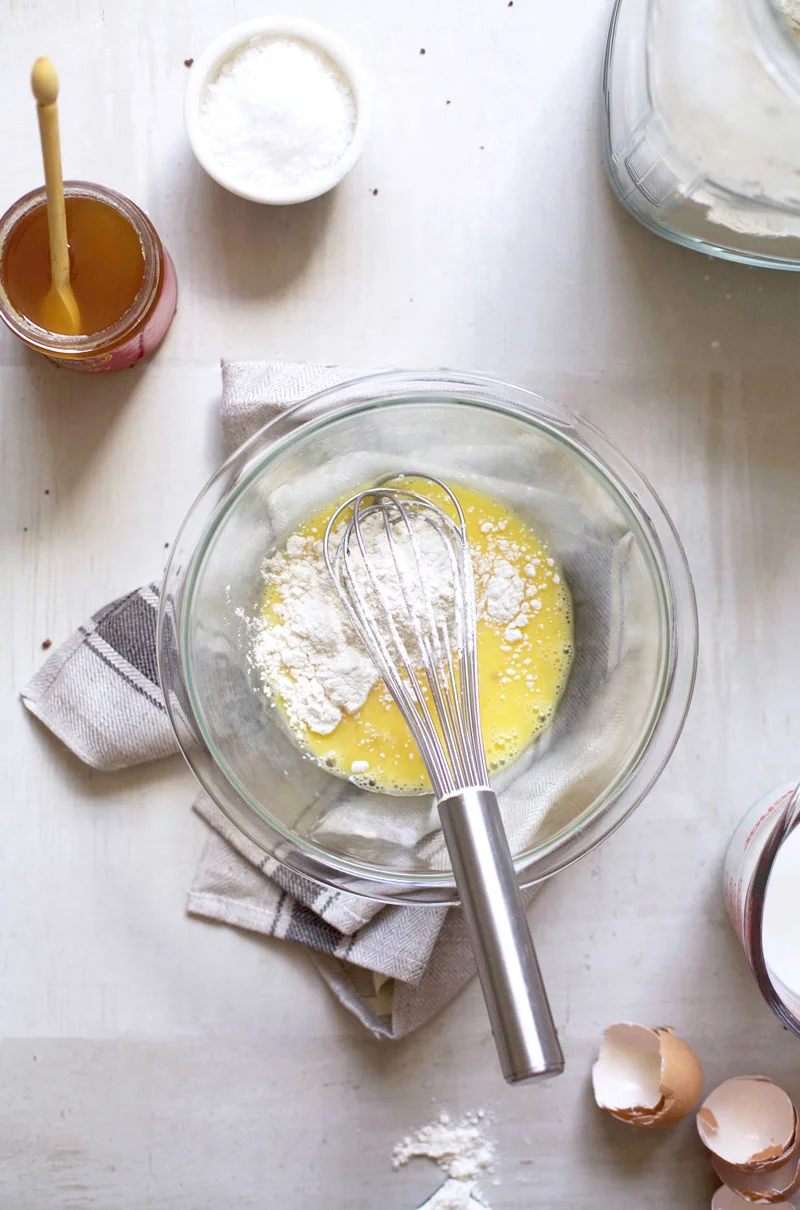 In a large bowl, whisk together the eggs, flour, salt, vanilla, sugar and honey. Continue whisking while slowly, but steadily, pouring in the melted butter and the buttermilk. Stir until no flour lumps remain and the mixture is slightly frothy. Pour into the crust. Bake for 15 minutes. Then, turn the oven down to 325 degrees. Cover the pie loosely with foil and continue baking for 40 minutes. Remove the foil, then bake for another 5-10 minutes, or until the top has turned golden brown and the pie is set. Remove from the oven and allow to cool for at least 3-4 hours before serving (you can also place it in the fridge to speed up the cooling times).