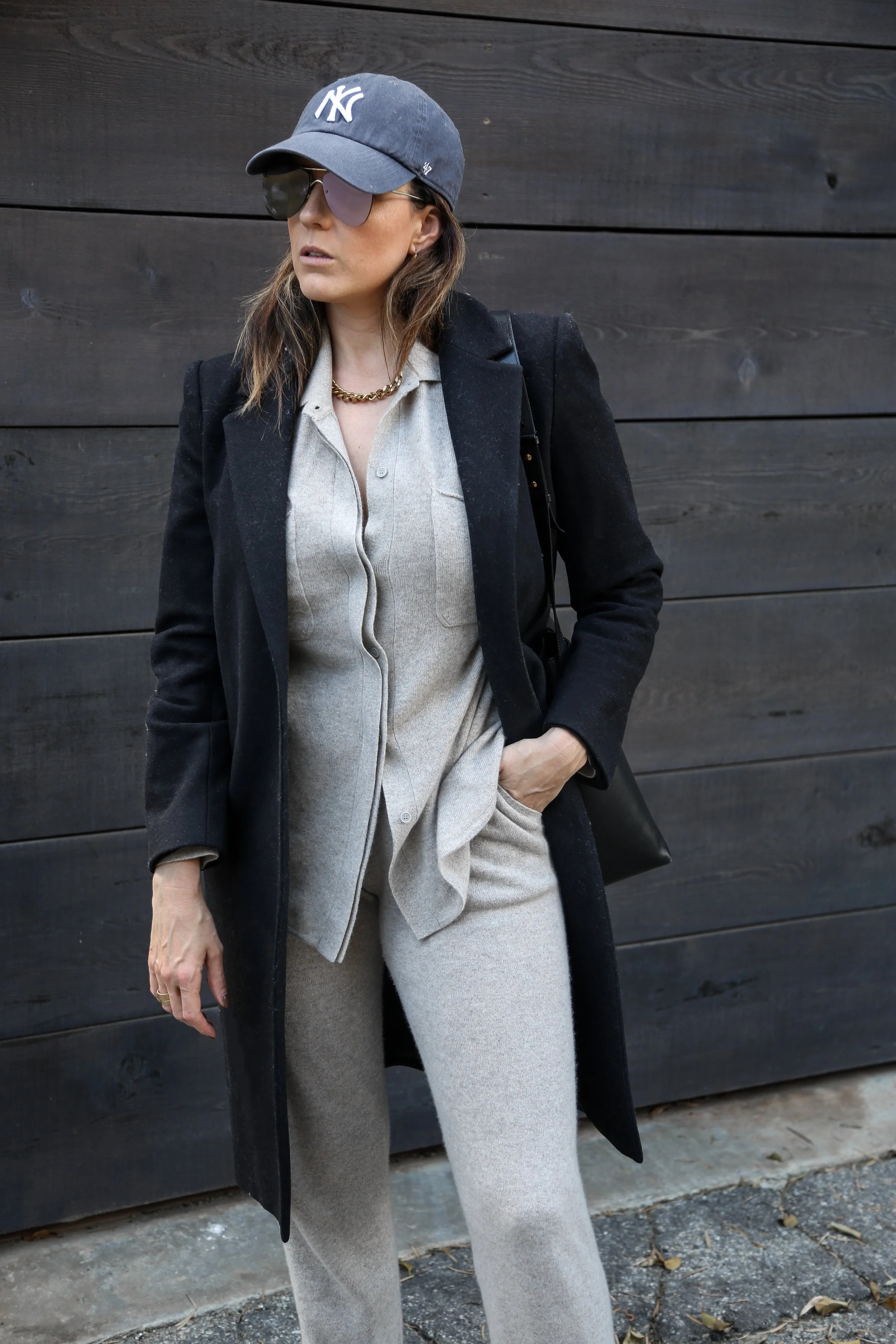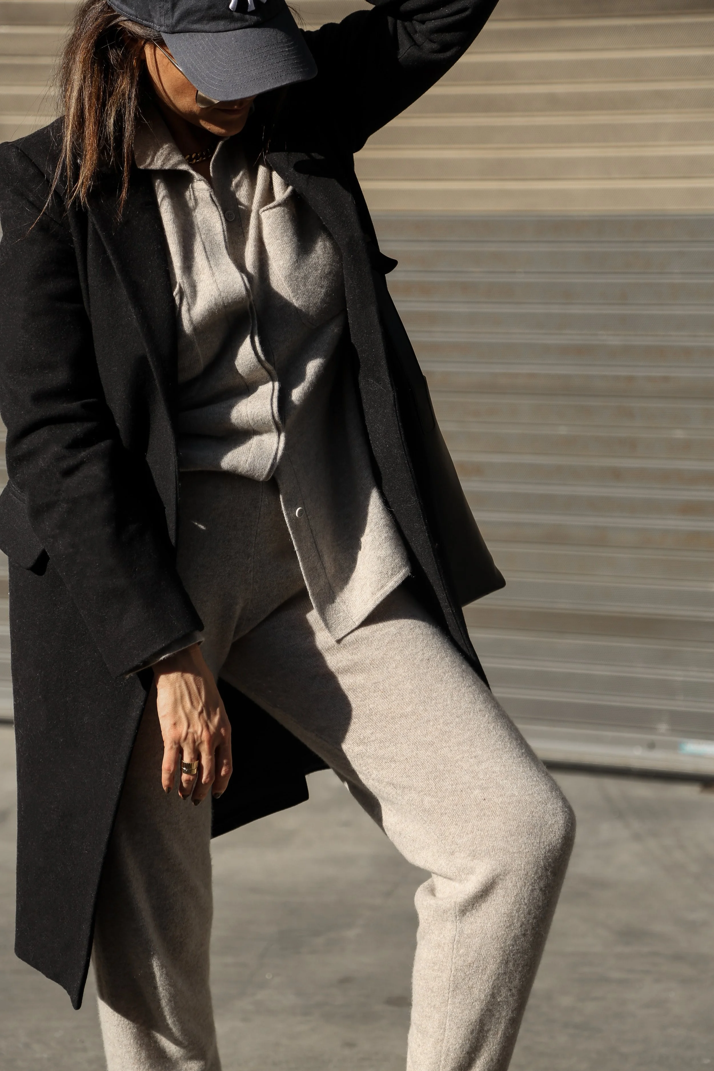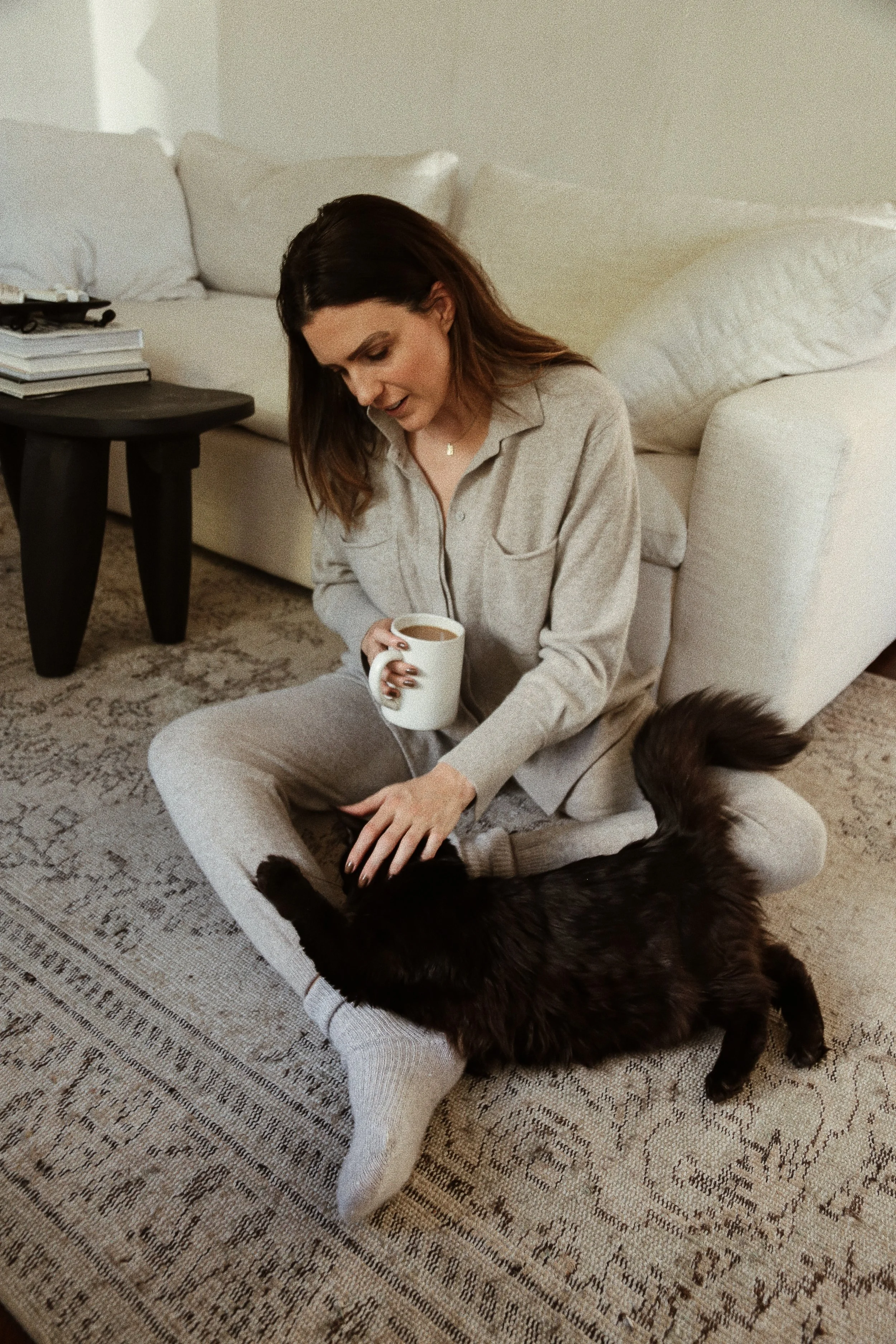 I recently got this luxuriously dreamy cashmere set from my forever favorite (especially for cashmere pieces), Brochu Walker. Wearing it feels a bit like wearing a wonderfully soft cloud. Aka I want to just float around in this set forever and never take it off. In other words, it’s just too good to only wear it inside and/or one way. I mean, as you can tell from the inside outfit photos, even Bomba gets how good this set is! Ha!