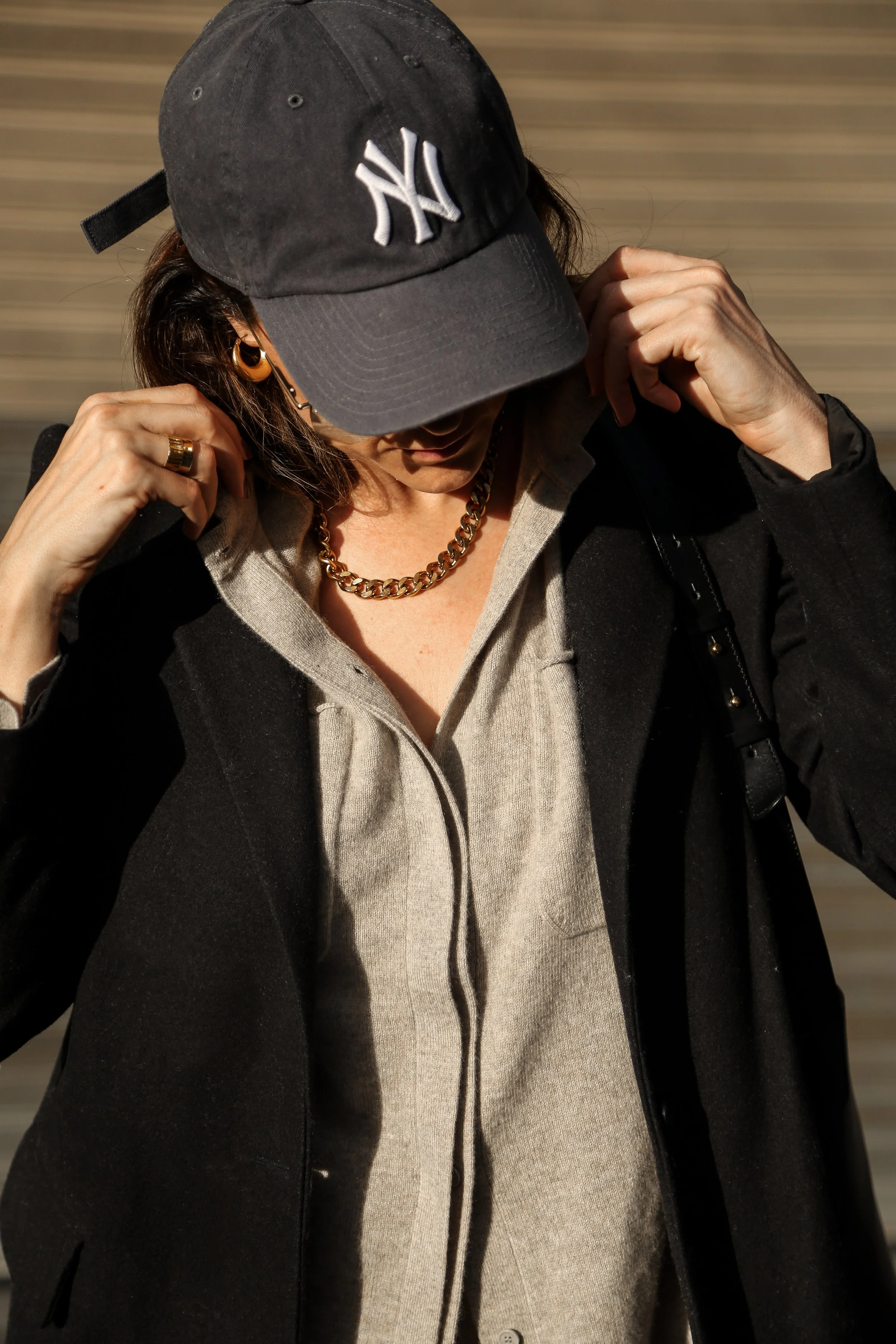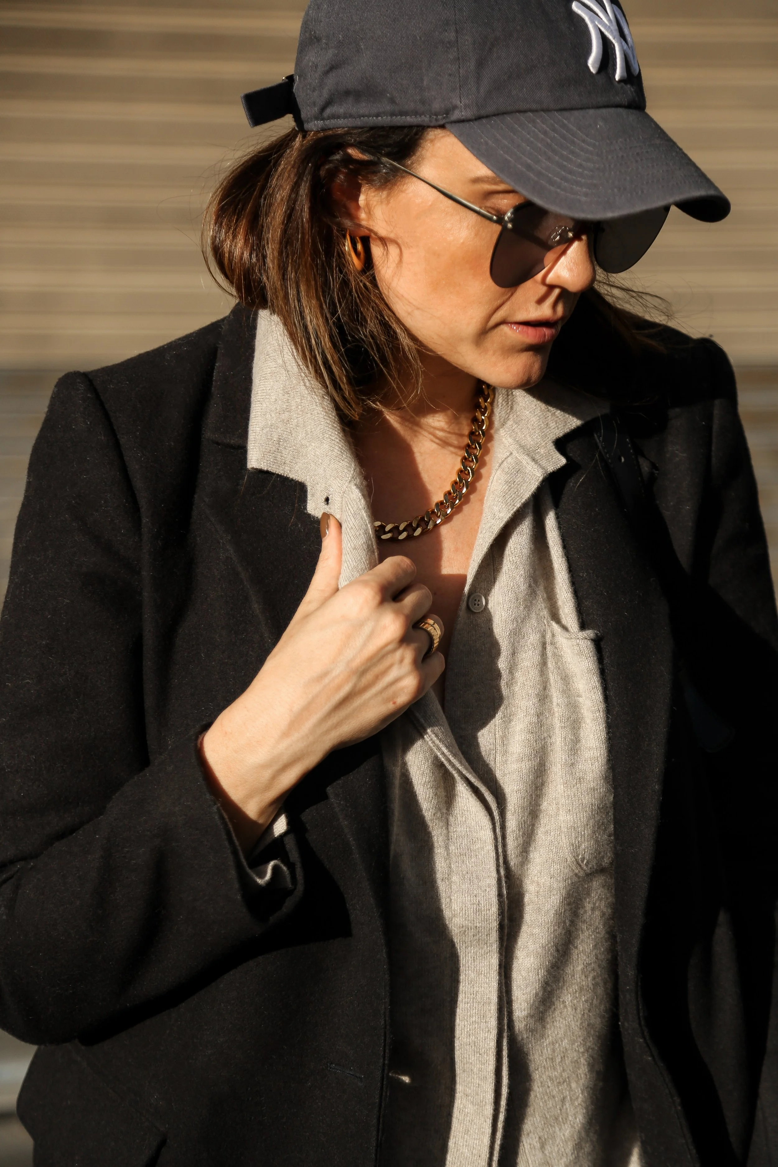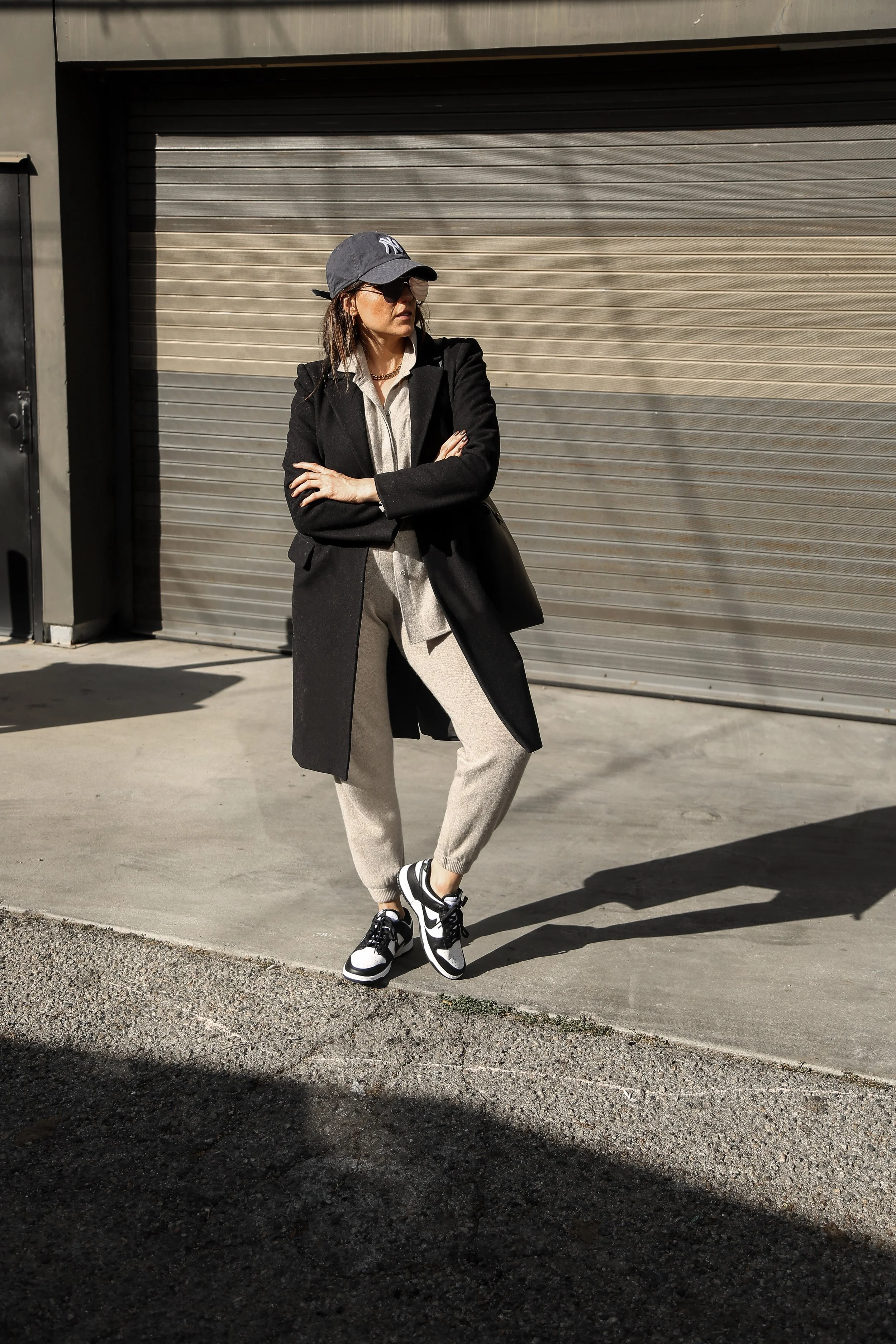 I recently got this luxuriously dreamy cashmere set from my forever favorite (especially for cashmere pieces), Brochu Walker. Wearing it feels a bit like wearing a wonderfully soft cloud. Aka I want to just float around in this set forever and never take it off. In other words, it’s just too good to only wear it inside and/or one way. I mean, as you can tell from the inside outfit photos, even Bomba gets how good this set is! Ha!