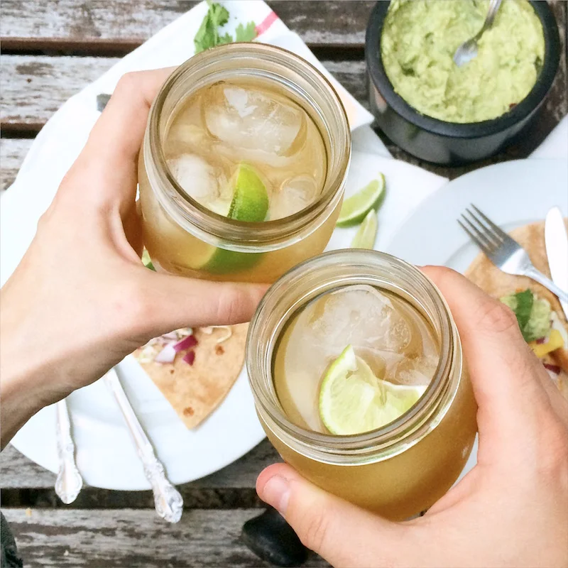 {Celebrating our first outdoor meal of the season with passionfruit mango margaritas}