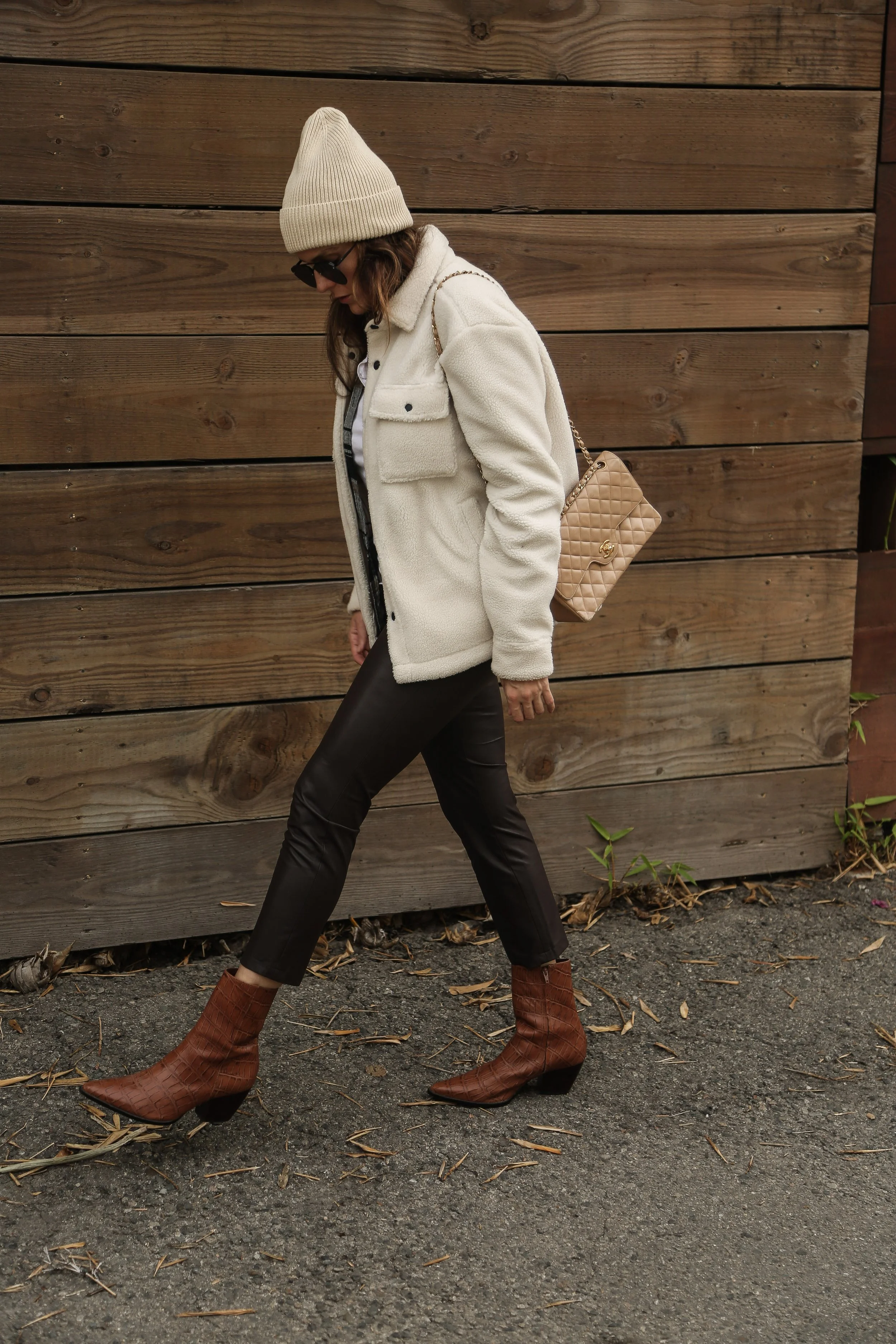 A cozy fall classic that I just can’t get enough of, especially paired with brown leather pants. Similarly to what I mentioned with the sweater vest, I love a shacket and leather moment as the oversized top balances out the tighter bottom to make for a perfect casual, cozy fall outfit. Plus, a shacket is great for fall layer a la the outfit I’m wearing in the photos in this post.