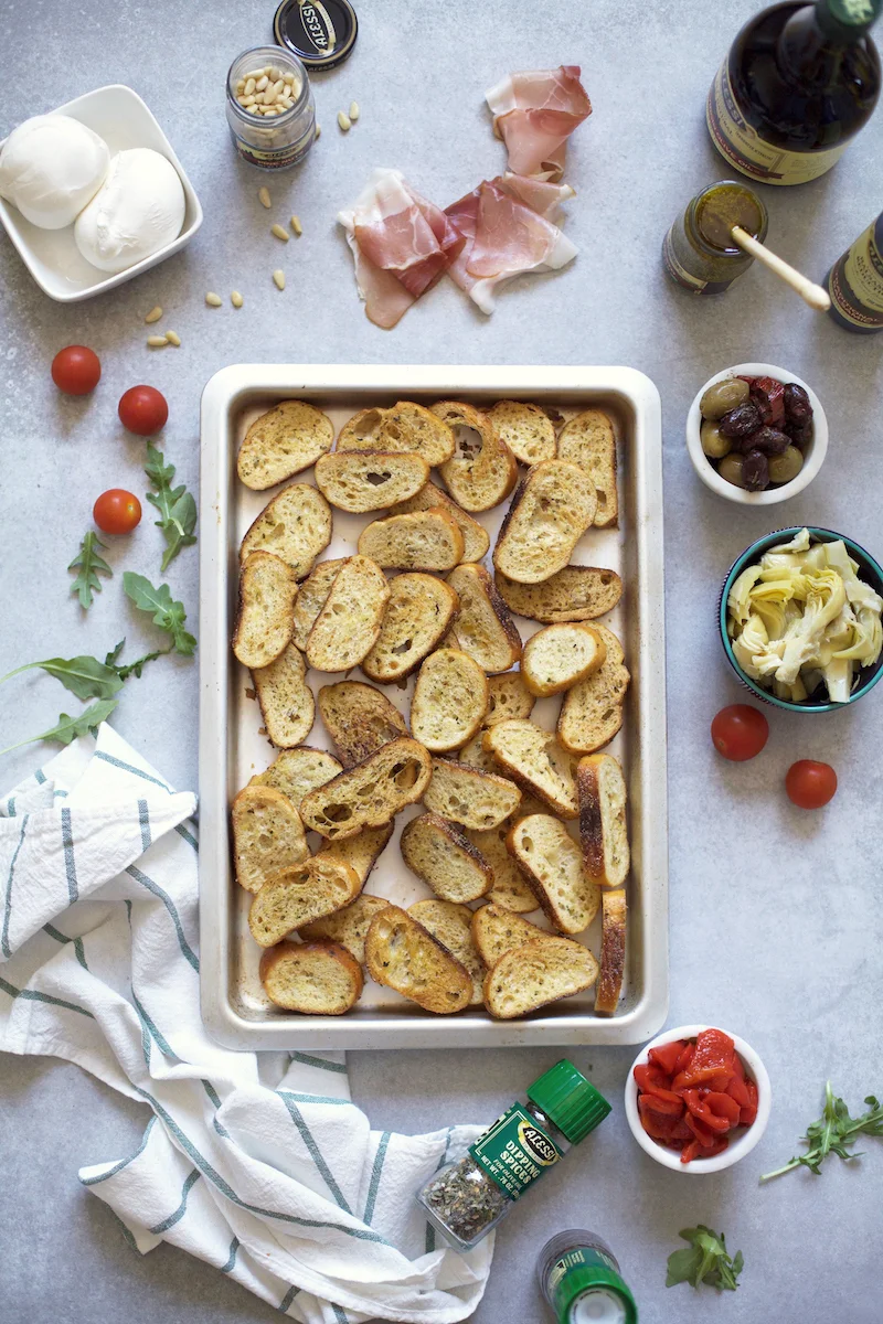 On a large serving dish or plate (I like to use a baking sheet), spread out the crostini.