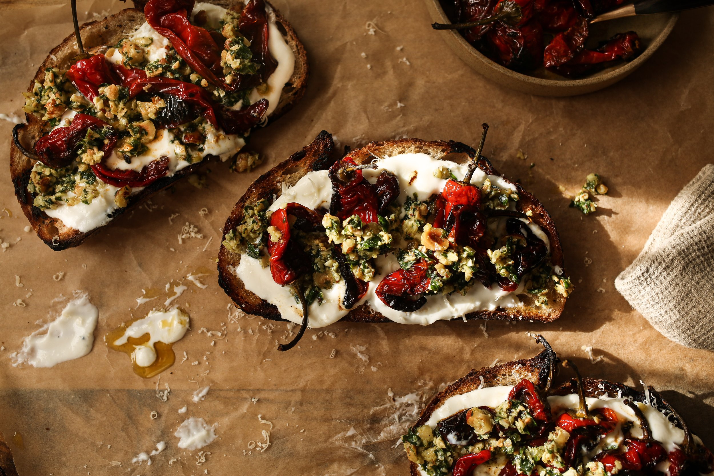 THE PEPPERS- You can blister the peppers up to 2 days in advance. Simply store them in a well covered bowl or airtight container in the fridge until you’re ready to use them, then let them come to room temperature before assembling the toasts