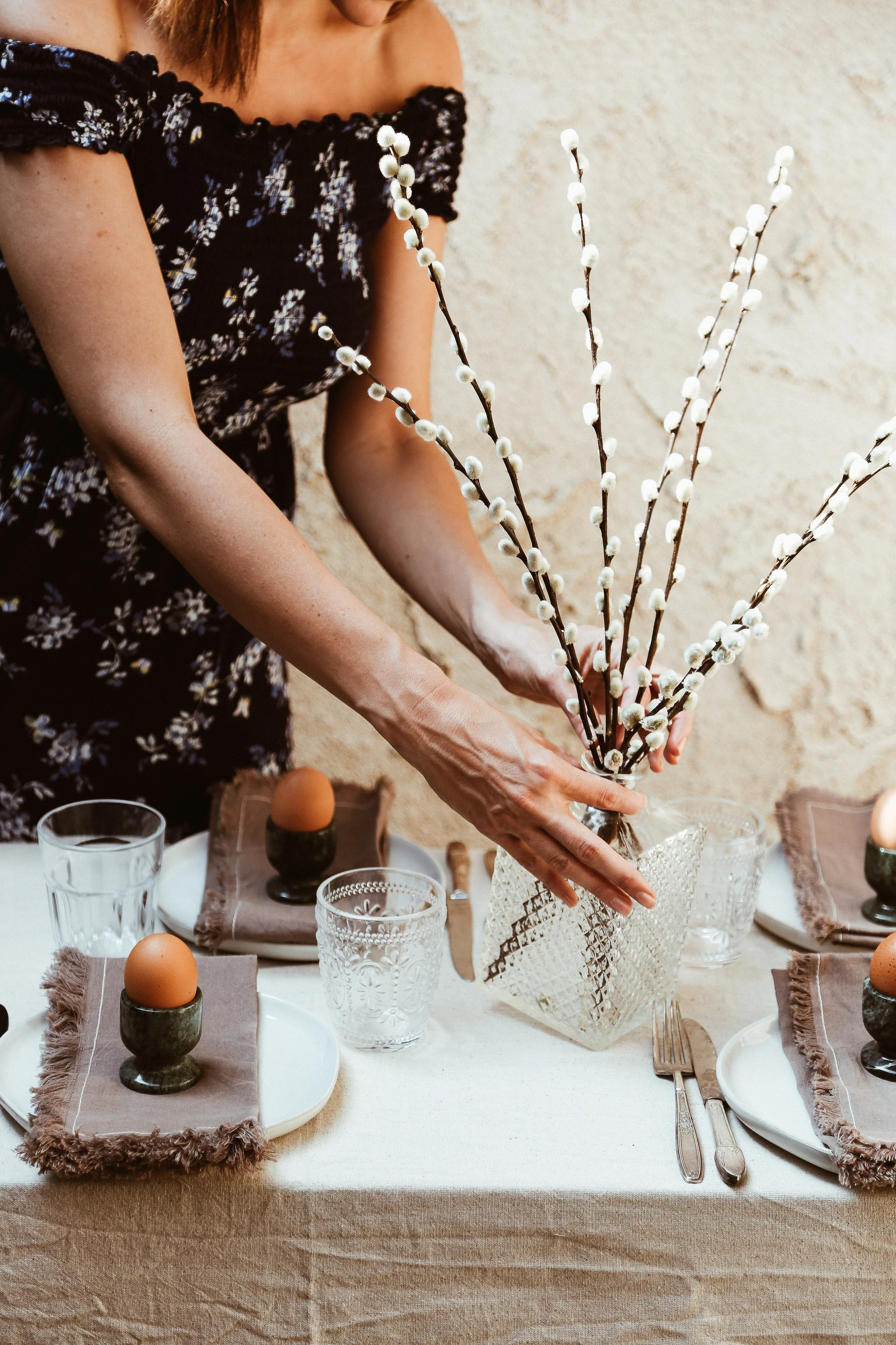 This one probably goes without saying, but it’s spring. You need some flowers, or spring-y element, in your centerpiece. This spring flower arrangement would be a great option, but you can also keep it really simple and just use lilacs or hyacinth, tulips or lilies, a few cherry blossom branches (one of my favorite options), or pussywillow branches, like I’ve done here. I like how they add a fun textural element to the table without adding color, and even though they aren’t a pastel color, it’s still something that represents spring. I always remember going out and foraging pussywillow branches with my Mom as a kid and then using them as our Easter egg tree, so they continue to be a favorite Easter table centerpiece for me because of the special memories tied to them.